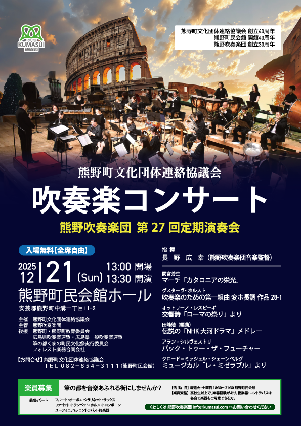 【 主 管 】 熊野吹奏楽団 【 後 援 】 熊野町 熊野町教育委員会 広島県一般吹奏楽連盟 筆の都くまの町民文化祭実行委員会 フォレスト楽器合同会社